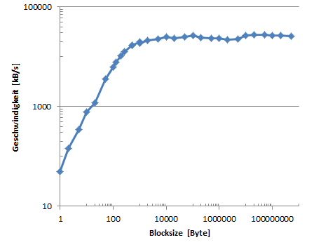 Die Auswirkung der Blockgröße habe ich mal etwas durchprobiert. In diesem Diagramm, sieht es so aus, als würde die Blockgröße nicht viel bringen. Der default Wert auf dem Test-System war genau ein Block der Festplatte mit 512 Byte. Das anheben der Blockgröße auf deutlich über 1MB bringt je nach Test 30 – 60 % mehr Geschwindigkeit.